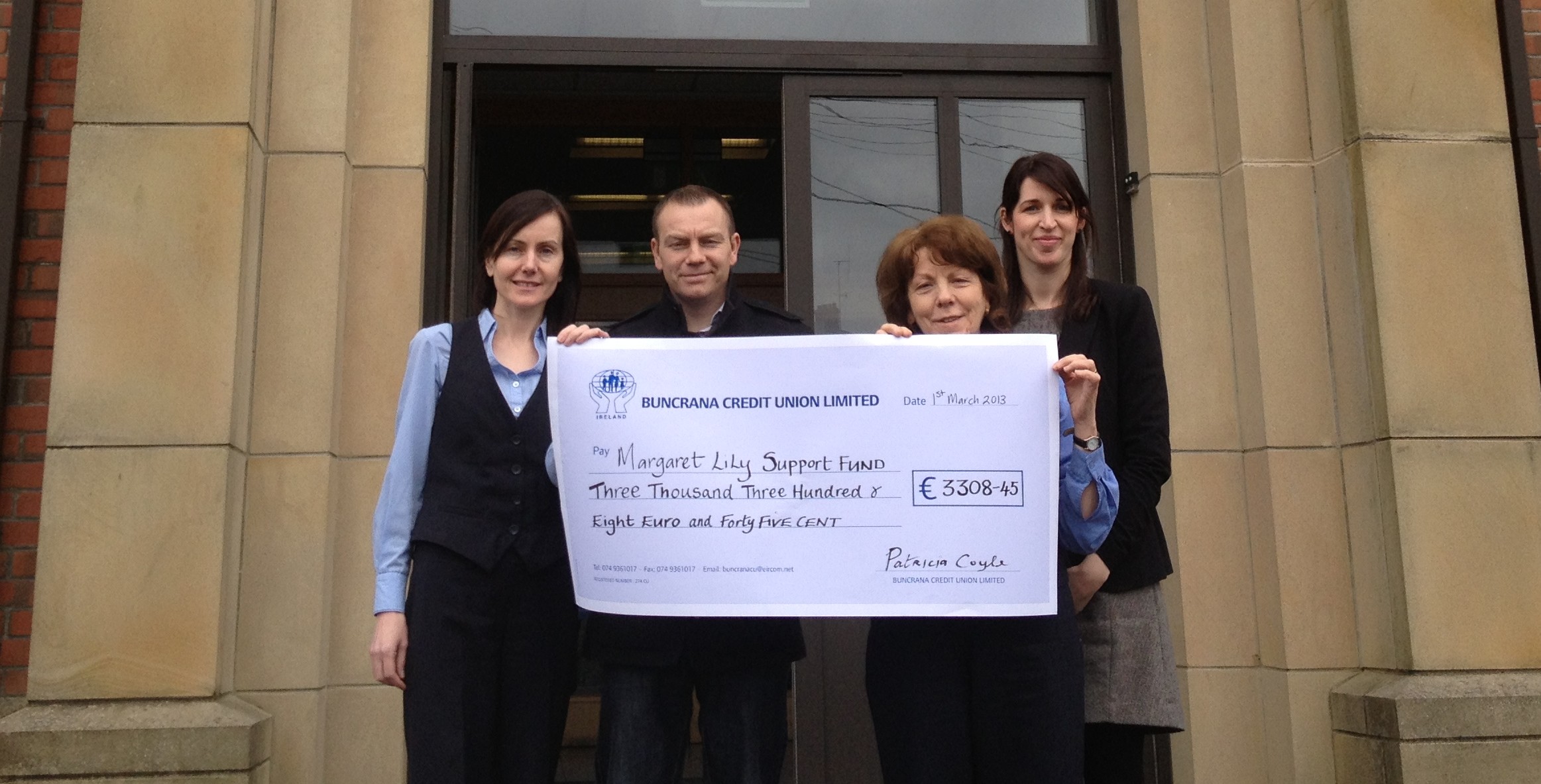 Buncrana Town Councillor Ciaran McLaughlin started a fund at the local Credit Union and now a cheque for 3,300 euro has been given to Ms Lilly.