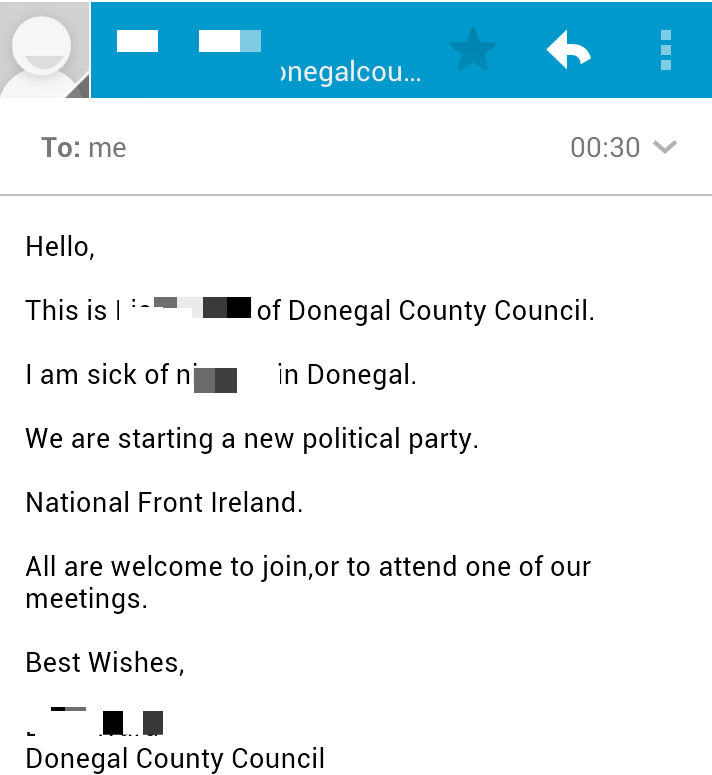 The letter uses racist language and claims the official is welcoming the formation of a new political party in Donegal.