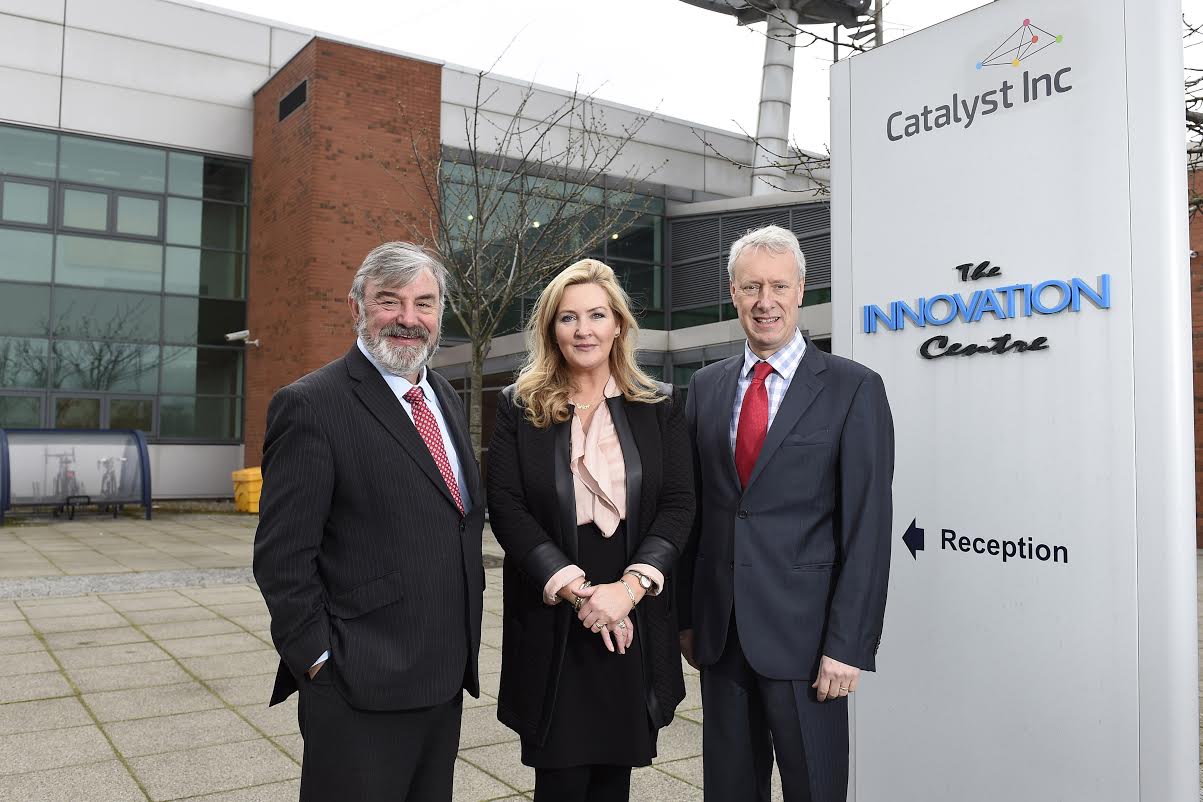 Photo (Michael Cooper): Pictured (l-r) Dr Norman Apsley OBE, CEO of Catalyst Inc; Gina McIntyre, CEO of the Special EU Programmes Body (SEUPB) and Philip Maguire, Director of Finance & Administration with Catalyst Inc.