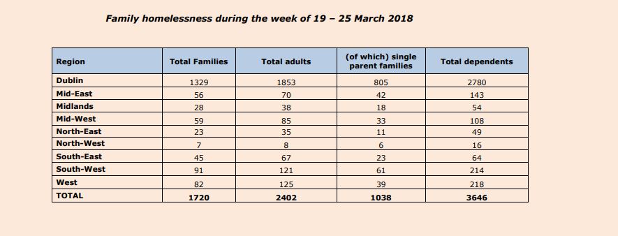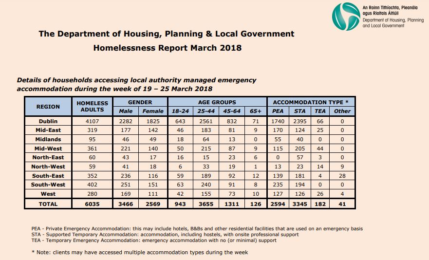 Latest figures published by The Department of Housing, Planning and Local Government show that during the week of 19th – 25th March 59 adults were recorded as homeless in the North West region, 26 in Donegal, 2 in Leitrim and 31 in Sligo.