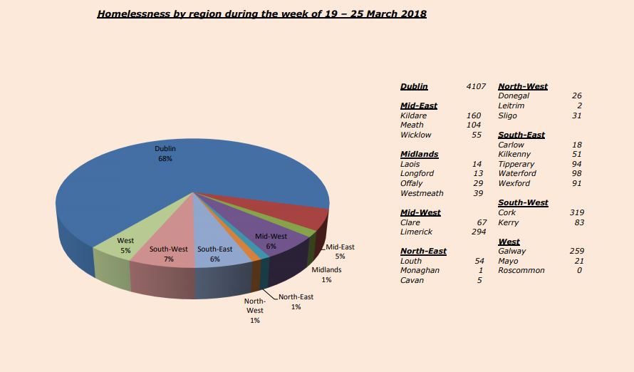 Donegal recorded the lowest homeless figure in the country last month, Dublin recorded the highest with 4107 adults presenting themselves as homeless.