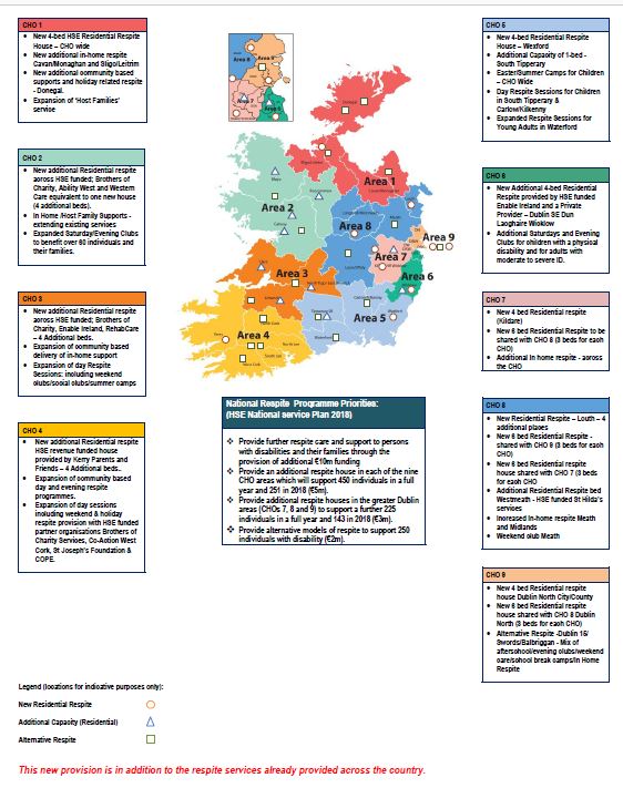 In CHO 1, which incorporates Donegal, Sligo, Leitrim, Cavan, and Monaghan, a new 4-bed Residential Respite House will be developed. New additional in-home respite is planned for Cavan/Monaghan and Sligo/Leitrim, while in Donegal, additional community based supports are planned, along with the holiday related respite.