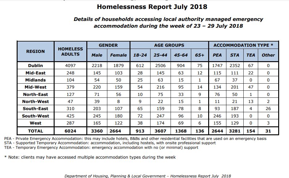 Figures released by the Department of Housing, Planning and Local Government show that the number of people accessing emergency accommodation during the week, 23rd – 29th July was 47, down on last year’s figure of 50.