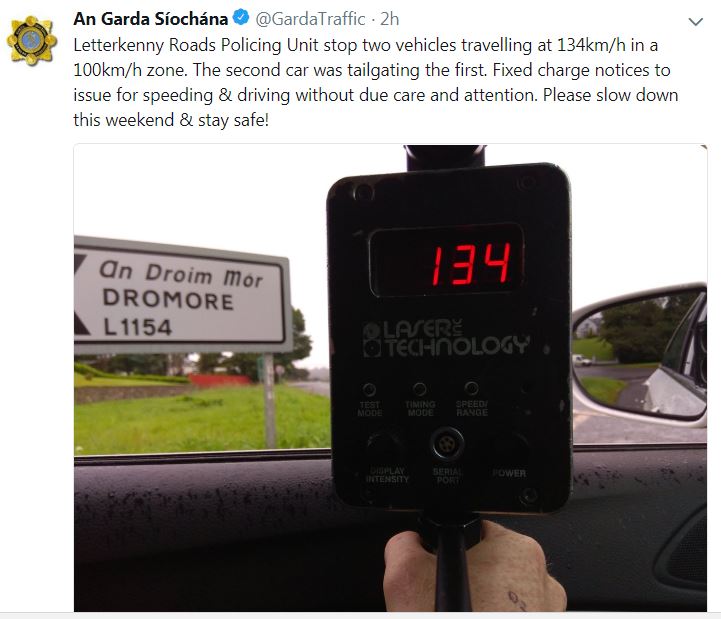 The Letterkenny Roads Policing Unit stopped the two vehicles in the Dromore area travelling at 134km/h in a 100km/h zone.