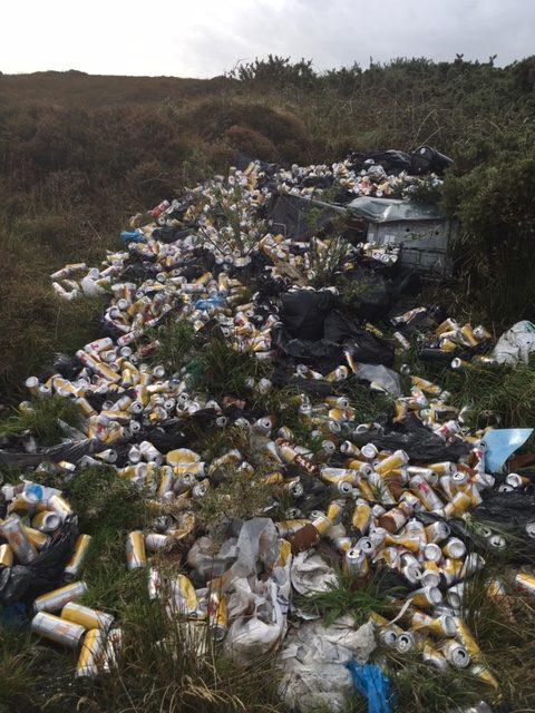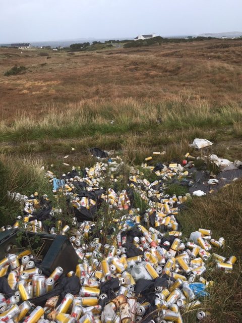 Up to a thousand used beer cans and other items were discovered strewn in a rural area of Ghaoth Dobhair in recent days.