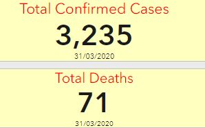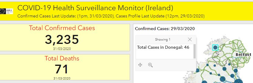 325 new cases were confirmed today, with a national total of 3,235. As of midnight on Saturday, 46 cases were confirmed in Donegal, a 24 hour increase of 10.