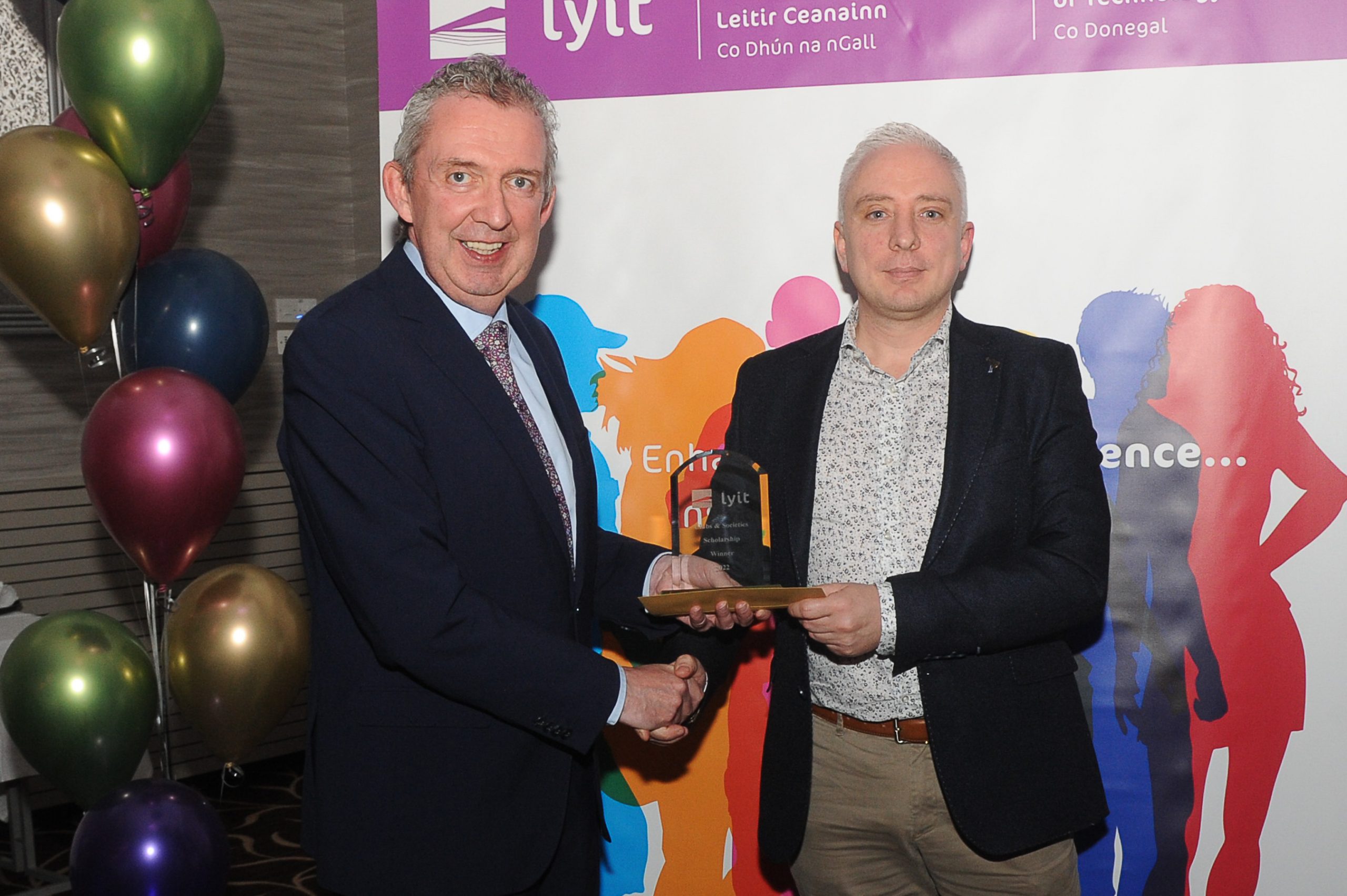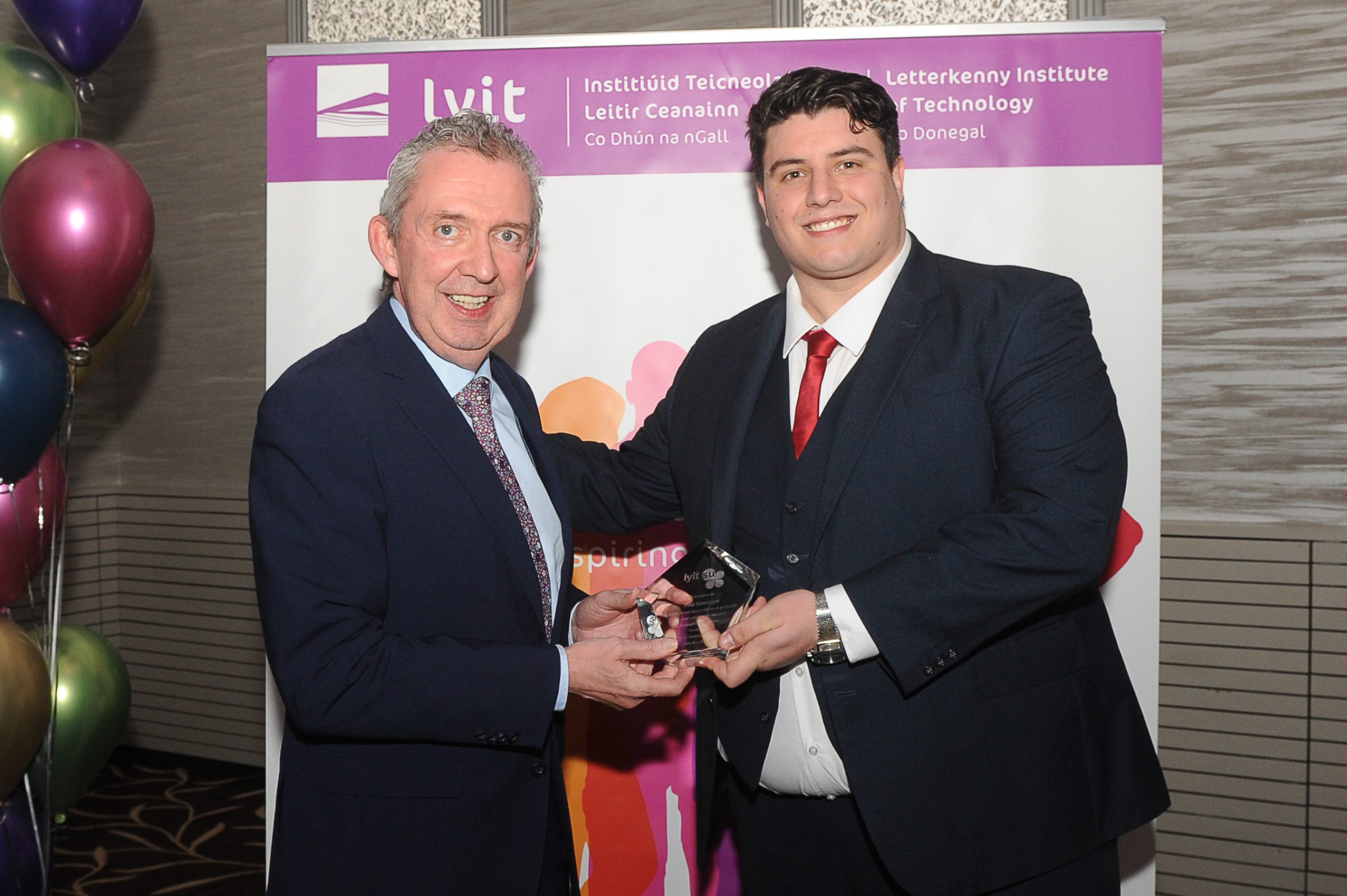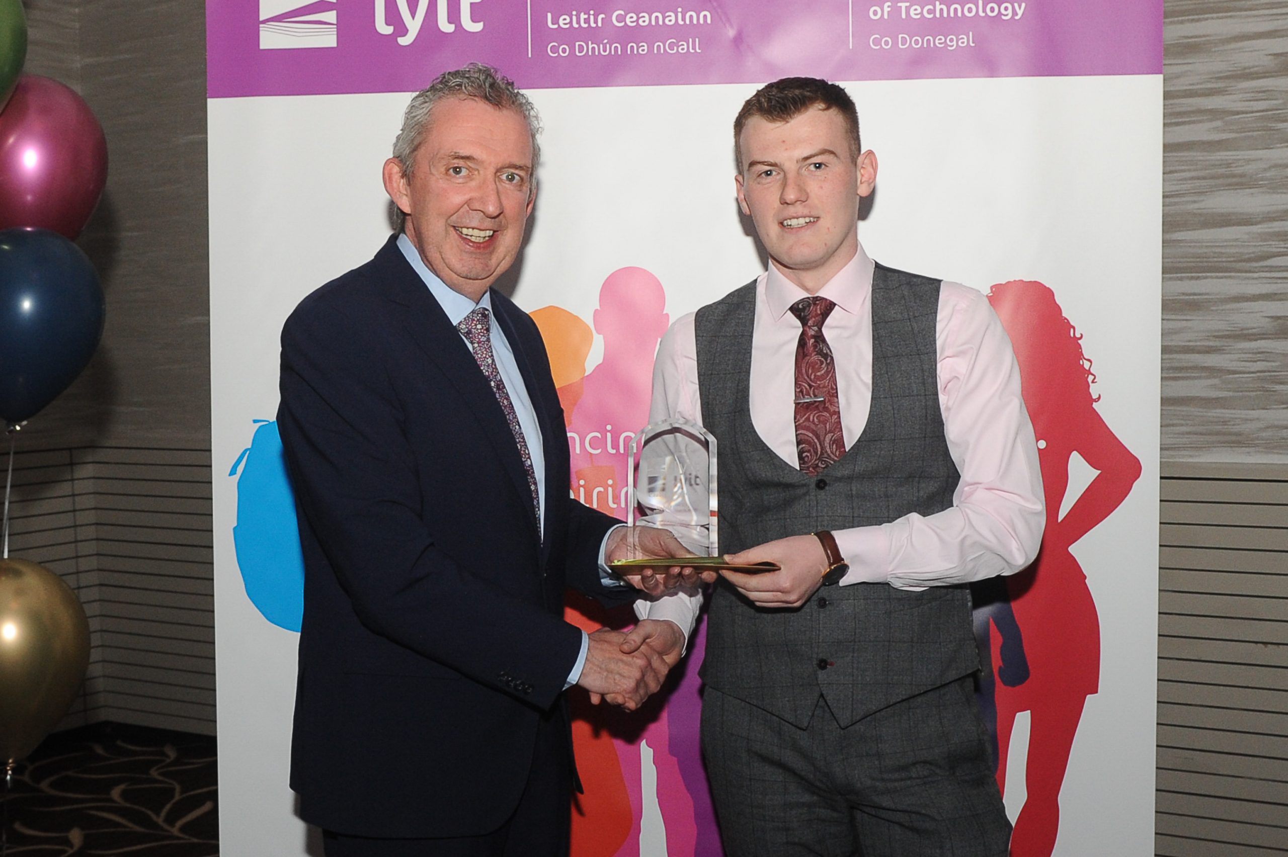 Pádraig McDonagh, Post Graduate Research Society receives a scholarship from Lyit President Paul Hanniganat the Lyit Student Achievement Awards at the Student Achievements Awards nigh held in the Radisson Hotel Letterkenny. Photo by Gerard McHugh