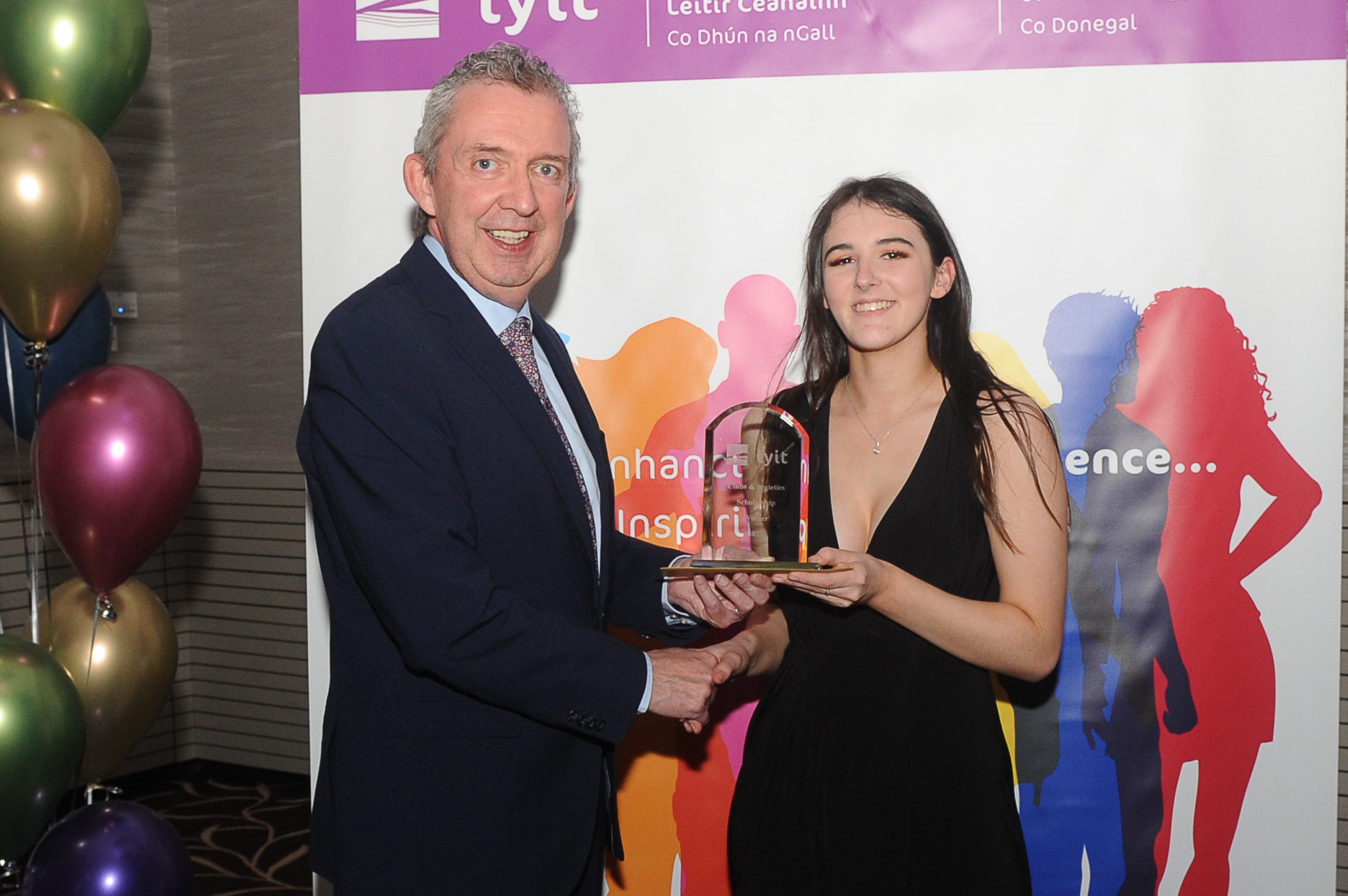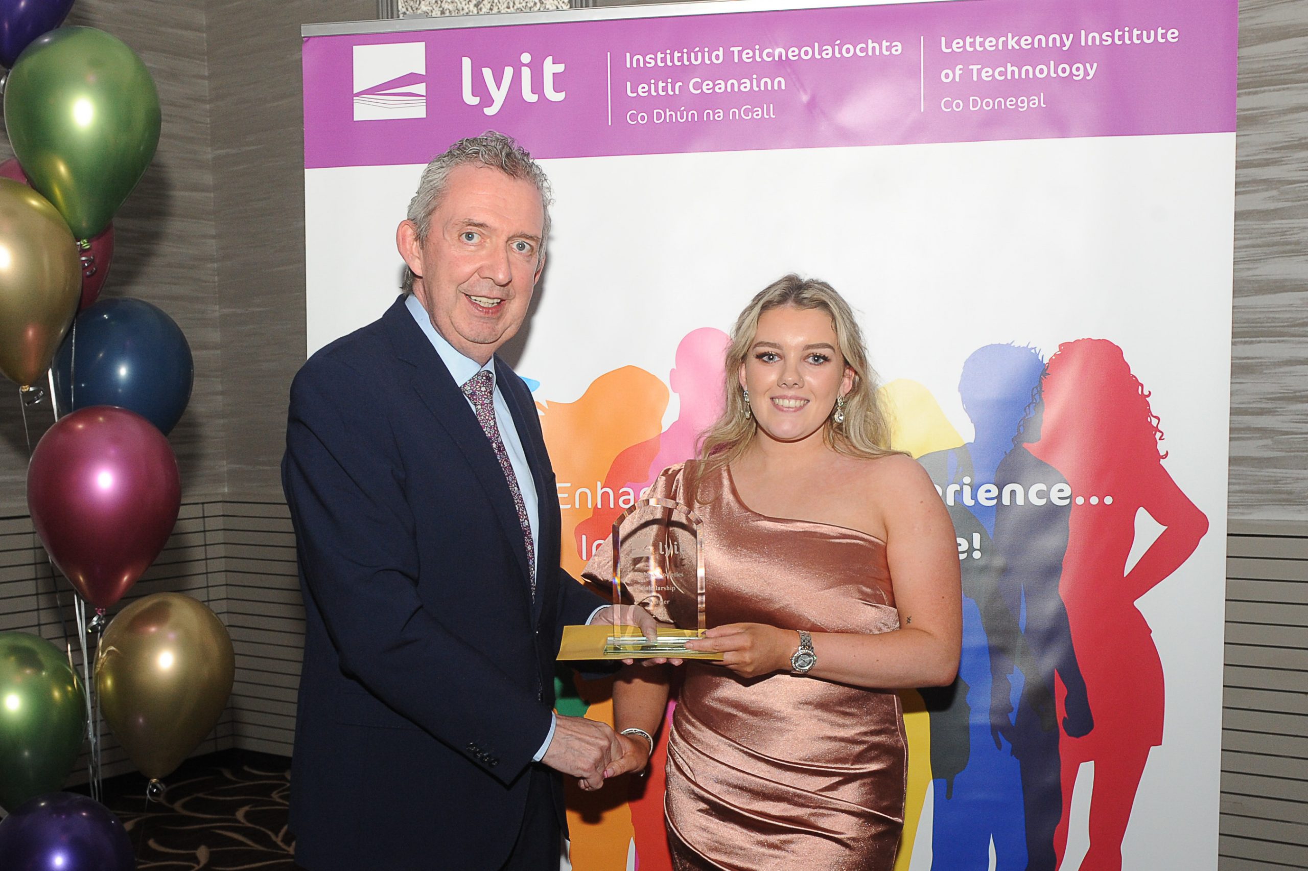 Caitlin Simkins, Law Society receives a scholarship from Lyit President Paul Hanniganat the Lyit Student Achievement Awards at the Student Achievements Awards nigh held in the Radisson Hotel Letterkenny. Photo by Gerard McHugh