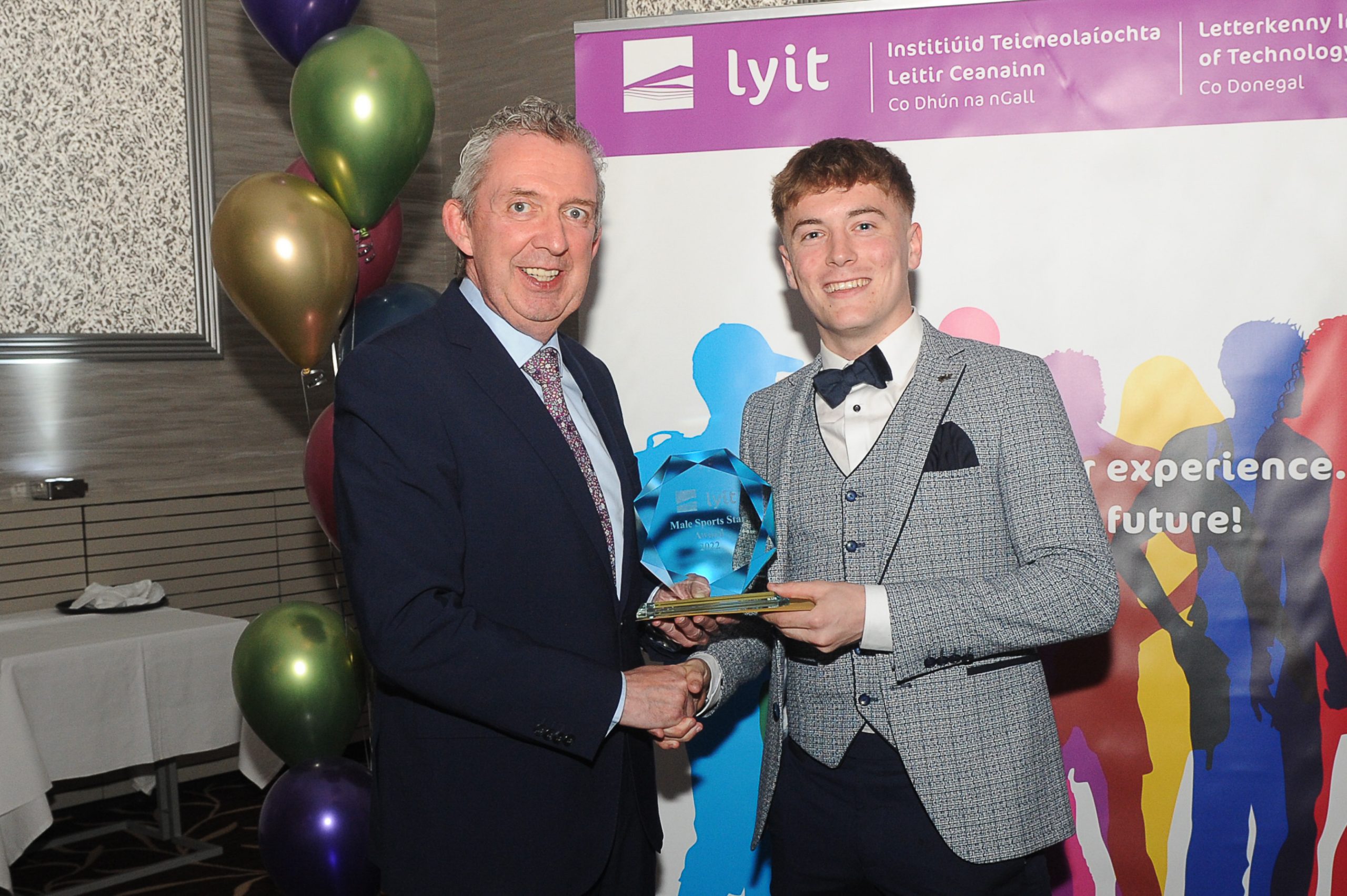 Lyit President Paul Hannigan presents Lyit Male Sports Award winner 2022 Pat Loughrey, Men’s Soccer Team at the Student Achievements Awards night held in the Radisson Hotel Letterkenny. Photo by Gerard McHugh