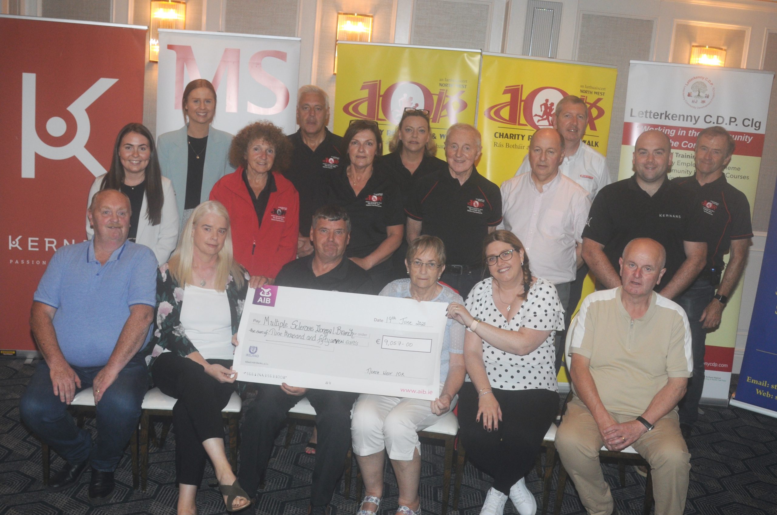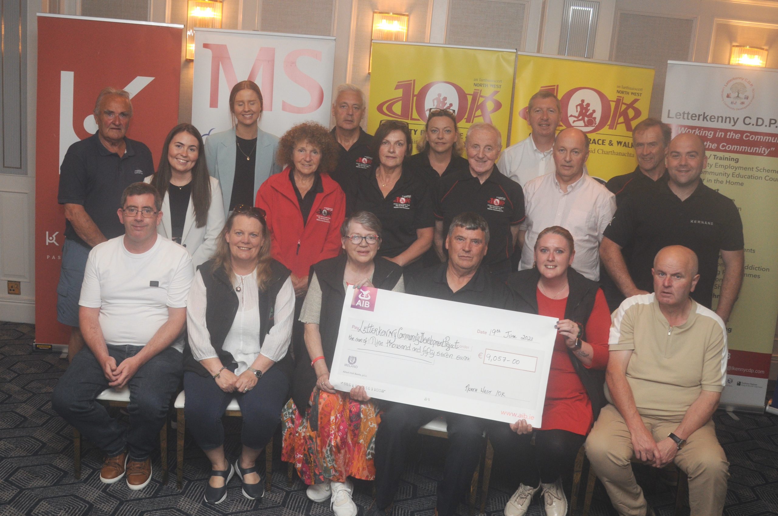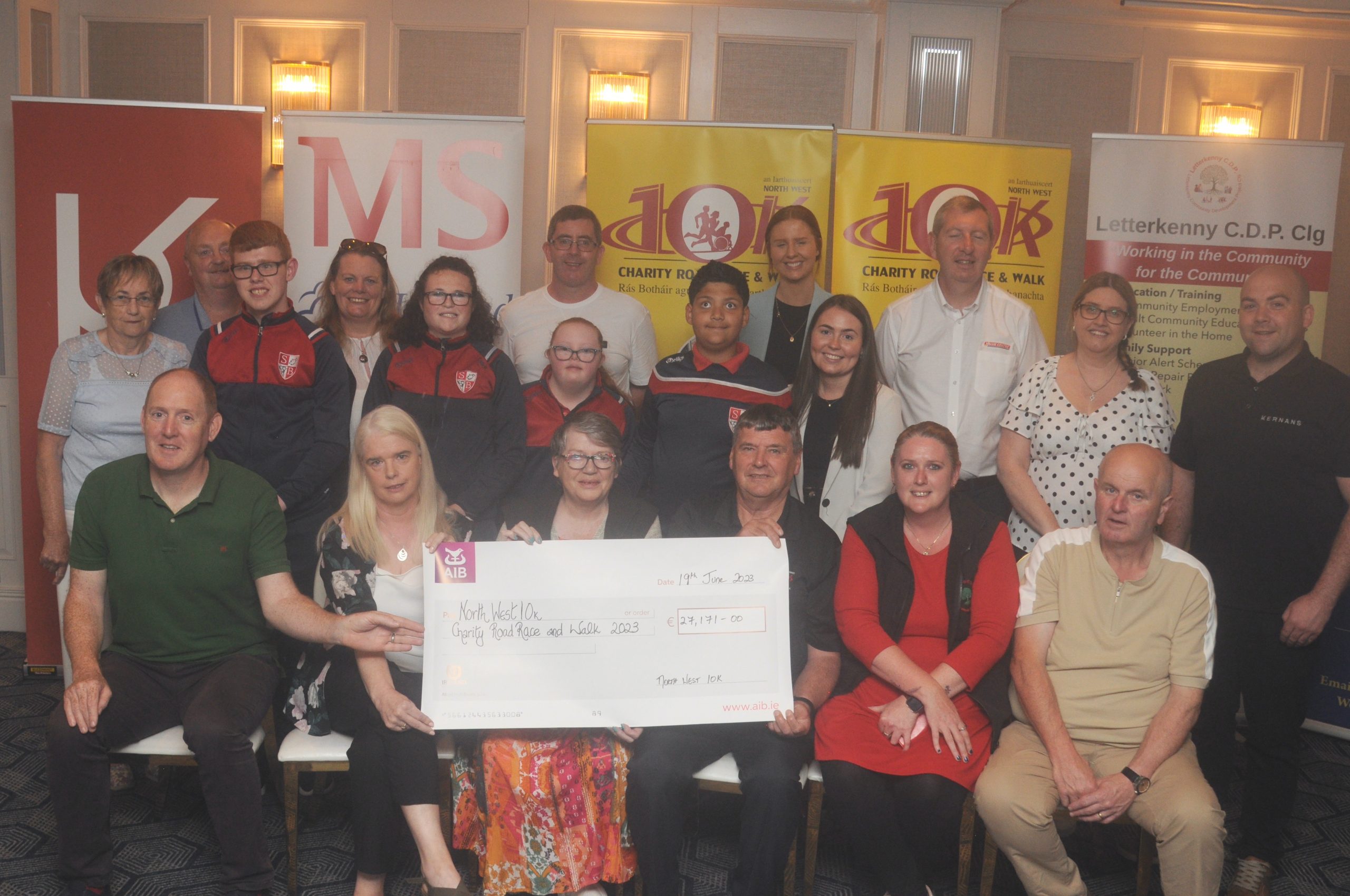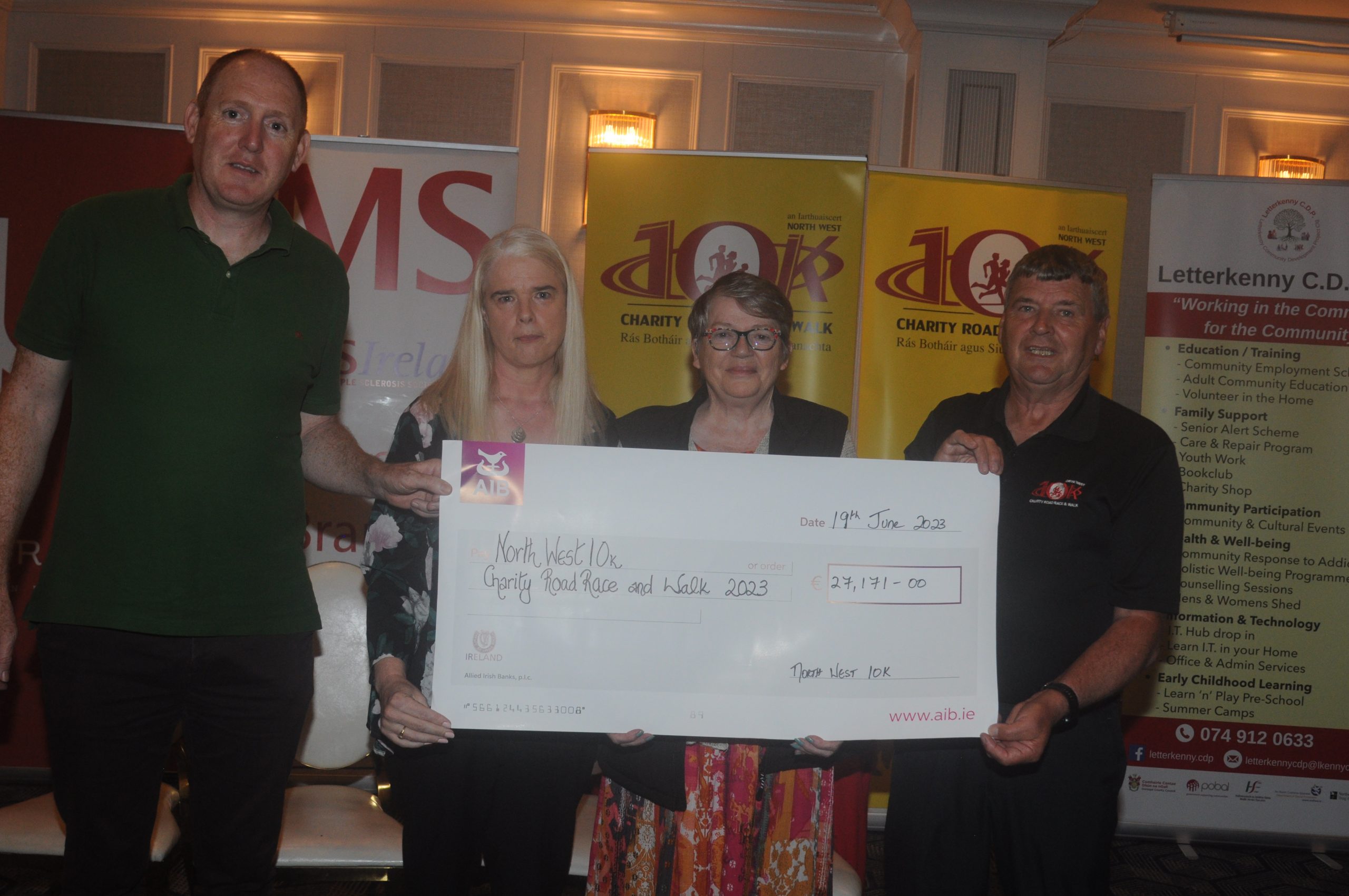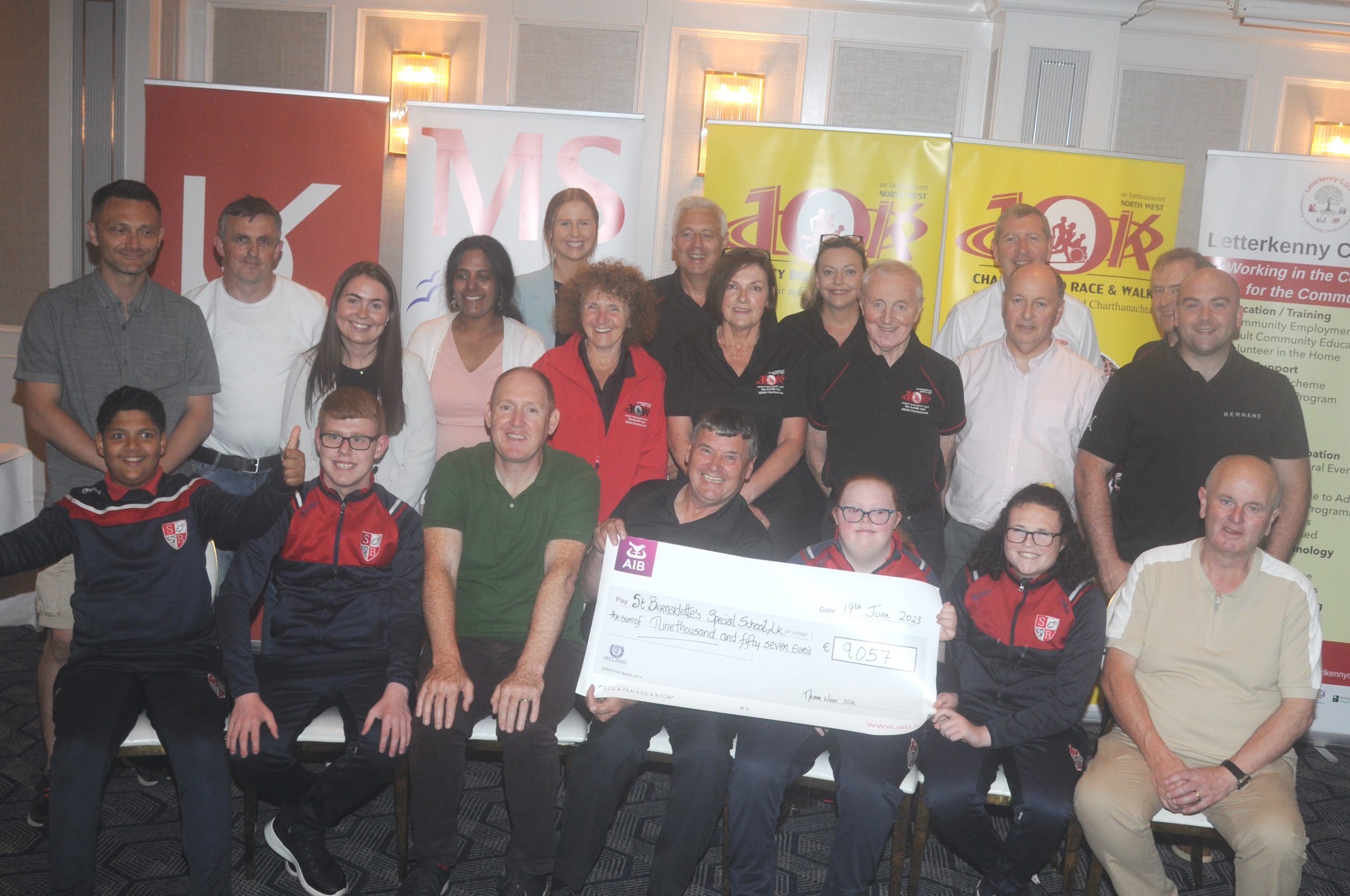 There was delight for three charities on Monday night when the North West 10k cheque presentations were made in the Mount Errigal. An overall figure of €27,171 was raised and was shared equally between St. Bernadette’s Special School Letterkenny, Multiple Sclerosis Donegal Branch and the Letterkenny Community Development Project. It was the 26th staging of the North West 10k and the overall figure since the charity event started in 1997 has now passed the €930,000 mark. Each charity received a cheque for €9,057 and spokespersons for the three beneficiaries expressed their delight at getting a financial boost that will help them deliver on live initiatives to enhance the services they provide.