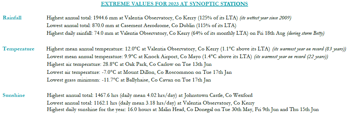 *Issued by Met Éireann on Thursday 4th January 2024. This report is based on available preliminary data from 25 principal weather stations operated by Met Éireann. Synoptic station data is midnight to midnight UTC. Long-Term Averages (LTAs) and “average” refer to the period 1981-2010 unless stated. A wet day is a day with 1.0 mm or more of rainfall. A dull day is a day with less than 0.5 hours of sunshine. A very wet day is a day with 10.0 mm or more of rainfall. Climatological dry periods – An absolute drought is a period of 15 or more consecutive days to none of which is credited 0.2 mm or more of precipitation. A partial drought is a period of at least 29 consecutive days, the mean daily rainfall of which does not exceed 0.2 mm. A dry spell is a period of 15 or more consecutive days to none of which is credited 1.0 mm or more of precipitation (i.e. daily tot < 1.0 mm). A heatwave occurs where there are 5 consecutive days or more with maximum temperature over 25°C (that is, a daily maximum screen air temperature > 25° C). The Island of Ireland dataset is 124 years long and runs between 1900 and 2023. For this dataset the long term averages from the 1961-1990 reference period are used for comparison as is standard for long-term climate change assessments. *Sunshine data is from the Autosol Network. LTAs for these sites are currently not used for comparison purposes. For more information, contact Met Éireann at 01-8064200 or e-mail: enq@met.ie