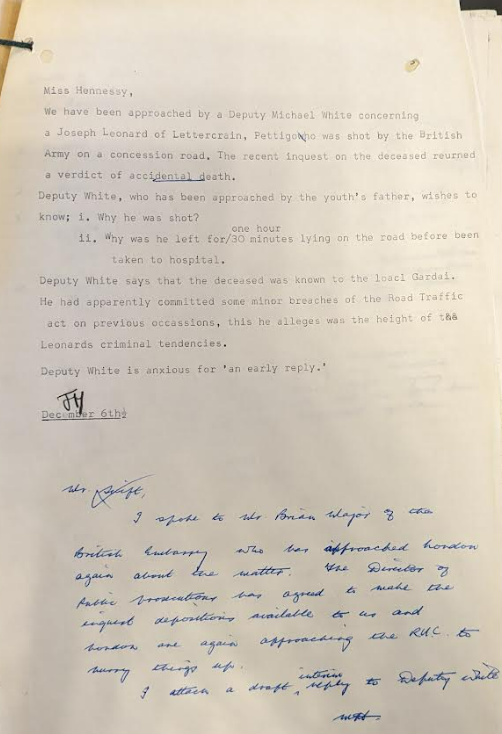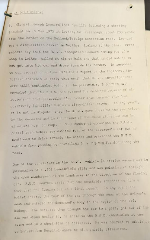 Paper Trail says it retrieved a Department of Foreign Affairs file in Dublin relating to the RUC’s fatal shooting of Michael Leonard on 17th May 1973, two hundred yards inside the Northern Irish border.