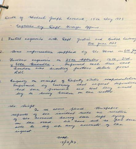 The Irish DFA’s Margaret Hennessy provided a handwritten record of enquiries by the DFA from the British state following its initial request for information from the Irish Department of Justice and British Embassy on 8th June 1973.