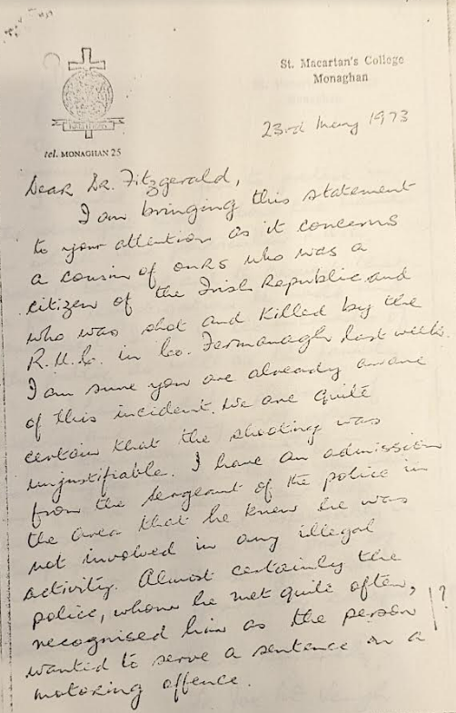 Belfast victims’ charity, Paper Trail, retrieved a Department of Foreign Affairs (DFA) file in Dublin relating to the RUC’s fatal shooting of Michael Leonard which occurred on 17th May 1973, two hundred yards inside the Northern Irish border.