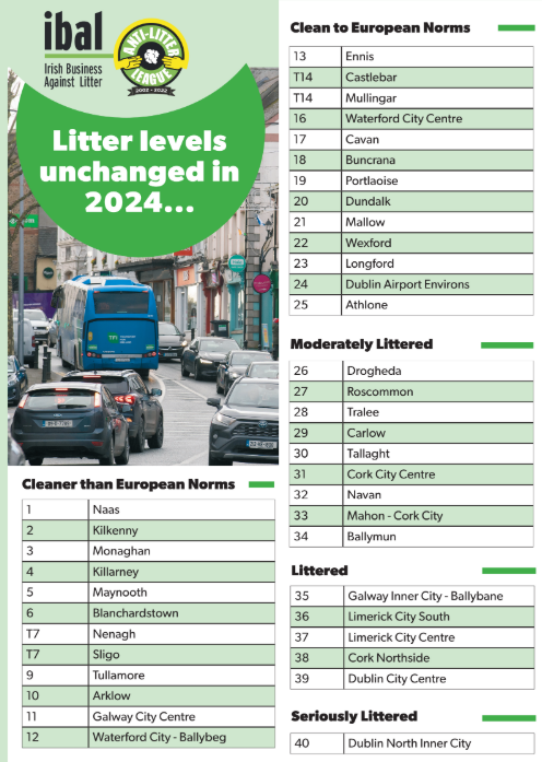 According to the latest IBAL survey, the town has been ranked 18th out of the 40 towns and cities surveyed across Ireland – improving from ‘moderately littered’ in 2024 to ‘clean’.