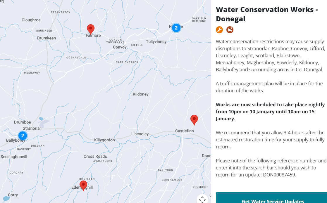 Uisce Eireann says water conservation restrictions may cause disruptions to water supplies in Stranorlar, Raphoe, Convoy, Lifford, Liscooley, Leaght, Scotland, Blairstown, Meenahoney, Magheraboy, Powderly, Kildoney, Ballybofey and surrounding areas until 10 o’clock this morning, and again from 10 o’clock tonight until 10 o’clock tomorrow morning.