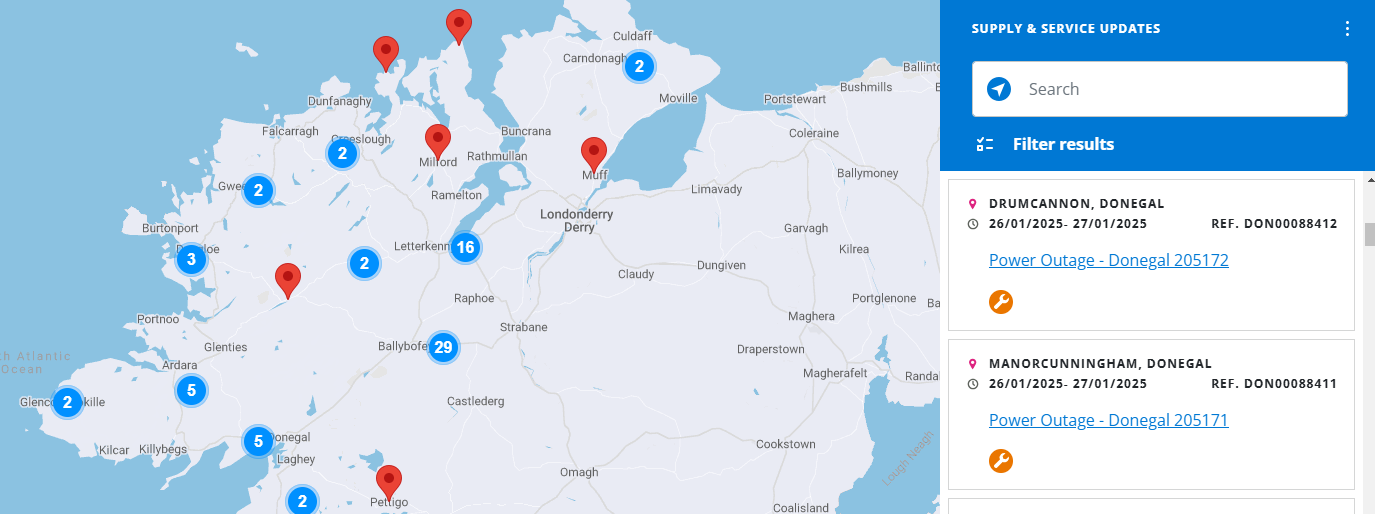 Problems are still emerging, includng a power outage may cause supply disruptions in South Donegal, with Mountcharles, Eddrim Glebe, Lough Eske, Drumgorman and surrounding areas inset to be affected.