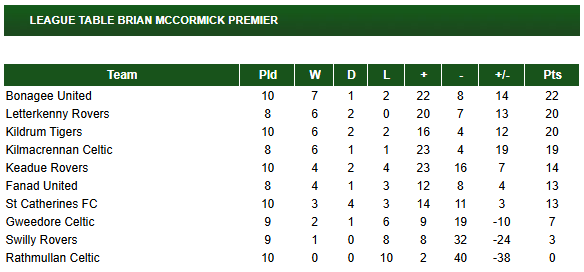 In the Donegal Junior League Brian McCormick Sports Premier Division, there are still four or even five sides still in contention for honours with almost half season to go for many clubs.