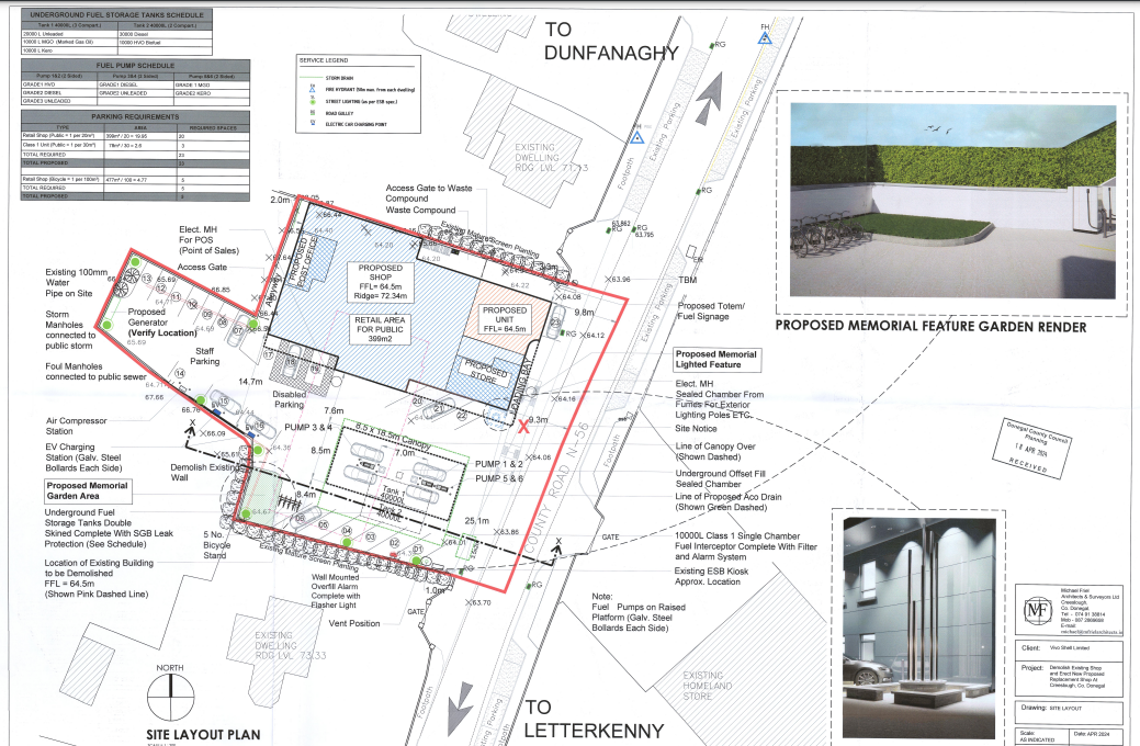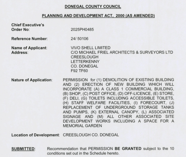 Planning permission has been conditionally granted for the demolition of the exisating building and construction of a shop and fuel forecourt at the site of the Creeslough tragedy.