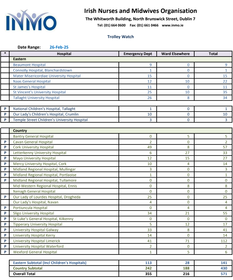 571 admitted patients were awaiting beds in hospitals around the country today.