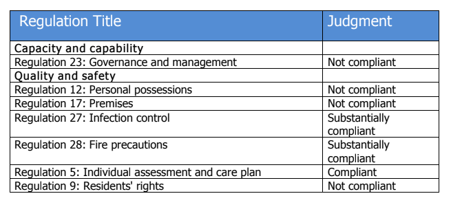 There were four non-compliances noted. They were in the areas of governance and management, personal possessions, premises and residents rights.