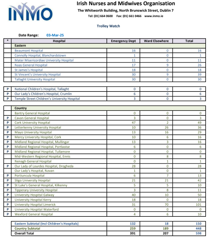 The INMO says there were 598 admitted patients awaiting beds across the country this morning, 391 of them in emergency department, and 207 elsewhere in the hospitals.