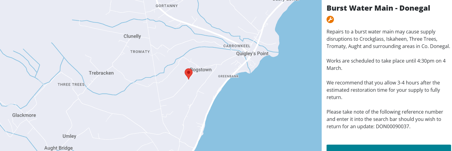 Uisce Eireann says repairs to a burst water main may cause supply disruptions in Crockglass, Iskaheen, Three Trees, Tromaty, Aught and surrounding areas in Inishowen today.