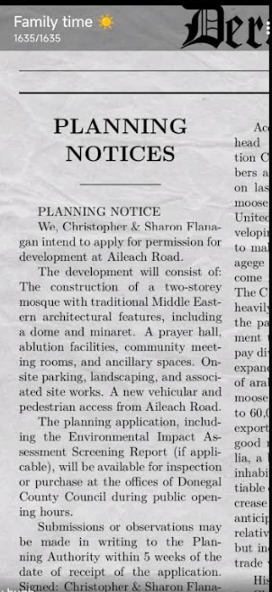 Christopher Flanagan says somebody created a fake Planning Notice, stating that he and his wife were seeking planning permission for a mosque on the shore front in Buncrana.