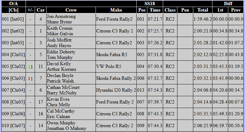 Defending Irish Tarmac Champions Keith Cronin and Mikie Galvin had been leading for most of the rally in their Citreon C3, but Jon Armstrong and Shane Byrne came through in the final few stages of Day 3 to take the win in their Ford Fiesta Rally 2.