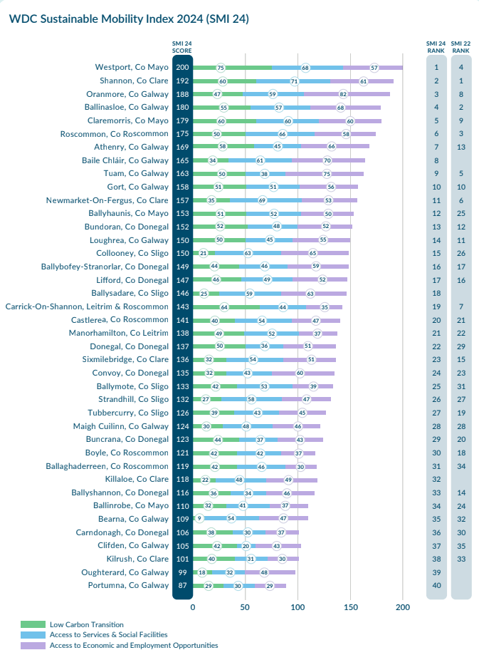 Allan Mulrooney, CEO of the WDC, welcomed the progress in the region; “This year’s Sustainable Mobility Index highlights just how much progress has been made in strengthening rural transport. It’s encouraging to see that targeted investment is making a difference—towns with enhanced sustainable transport infrastructure are climbing the rankings but it is essential that this investment is continued to ensure all our rural towns are well-connected and sustainable.”