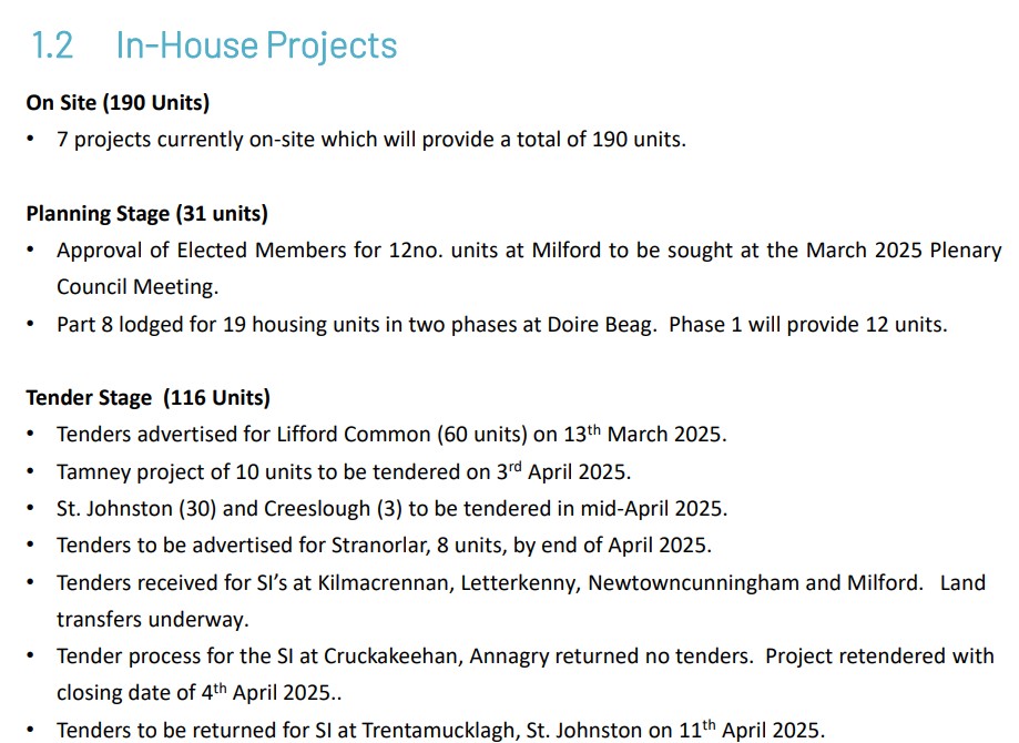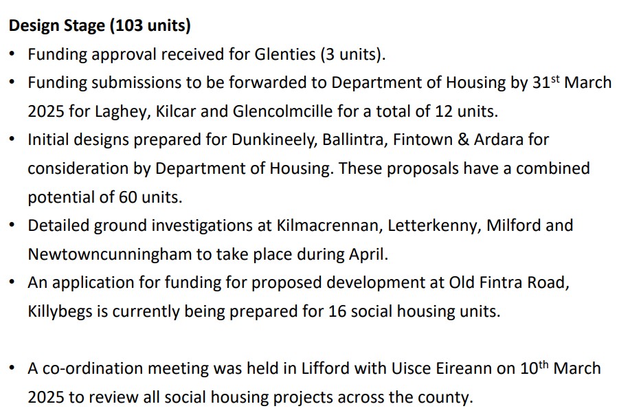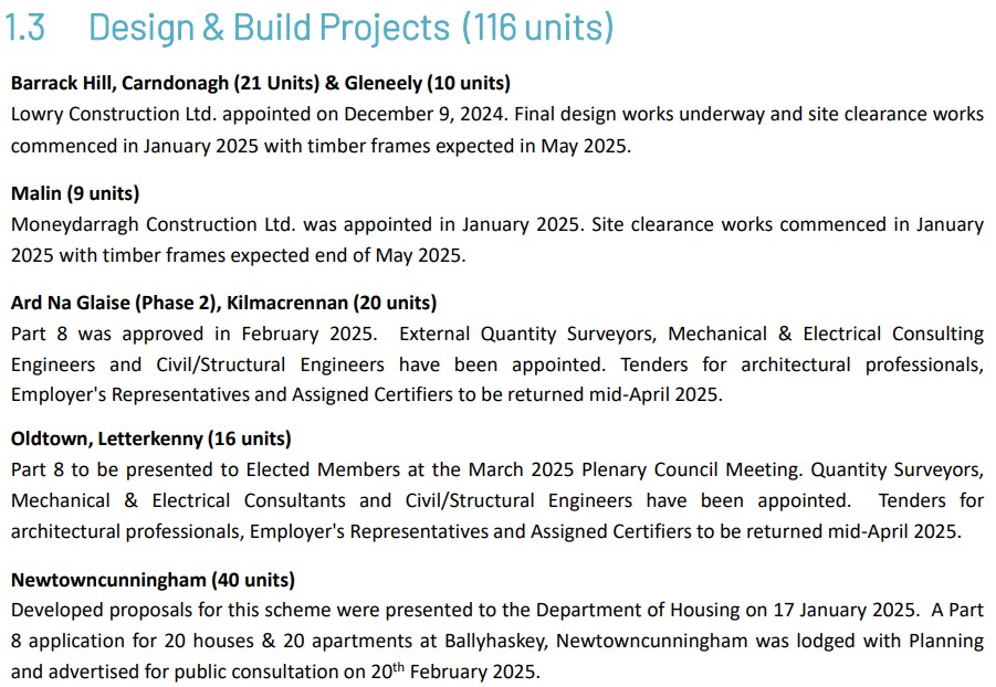 Additionally, work is ongoing on six design and build projects in Carndonagh, Gleneely, Malin, Kilmacrennan, Letterkenny and Newtowncunningham, encompassing 115 units.