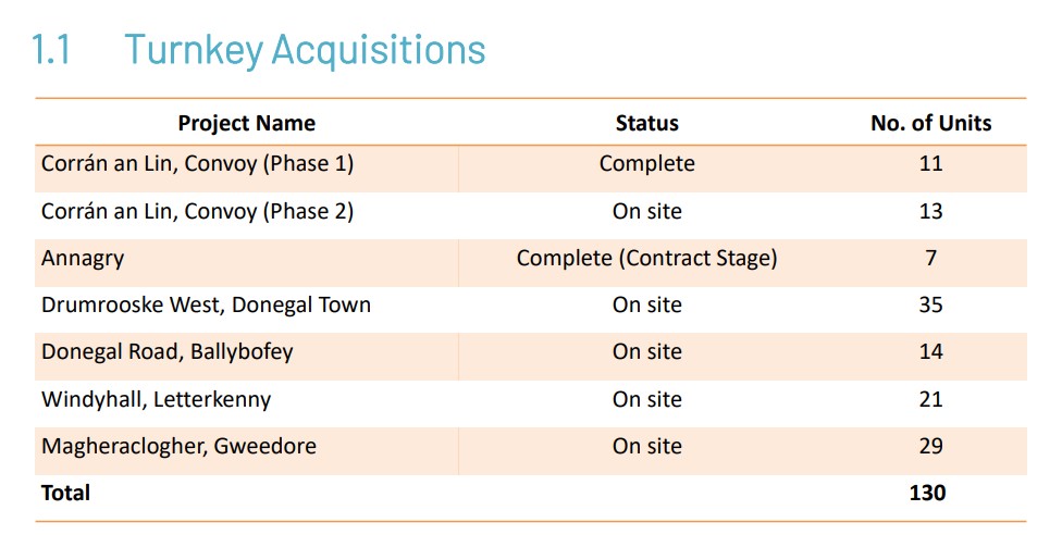 130 turnkey units are currently underway under the turnkey programme, with projects in Annagry, Ballybofey, Convoy, Donegal Town, Gweedore and Letterkenny.