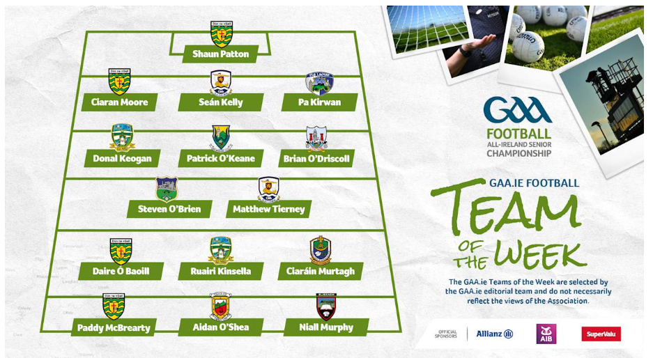 Shaun Patton, Ciaran Moore, and Paddy McBrearty, who kicked 0-7 in the win over Derry are also named.