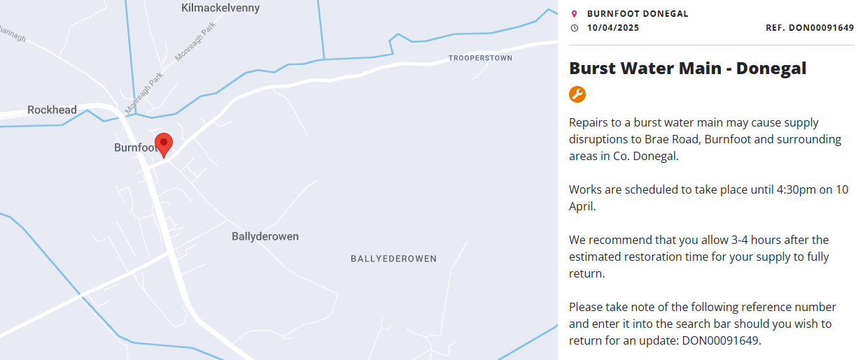 Repairs to a burst water main may cause supply disruptions to Burnfoot and surrounding areas in South Inishowen
