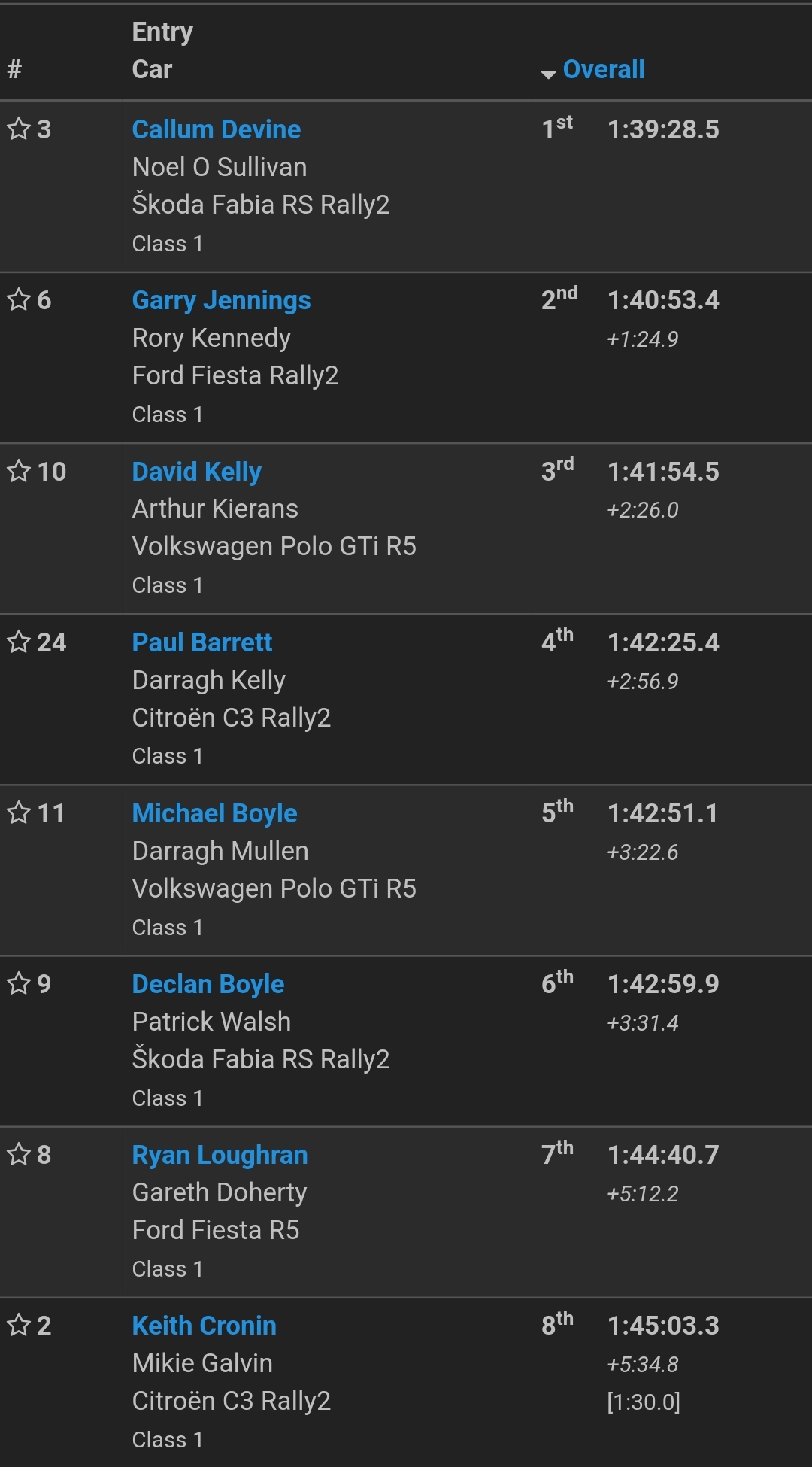Cronin, who had lead from the start of the rally before getting into trouble and is the Irish Tarmac Champion from last year, dropped down to 8th.