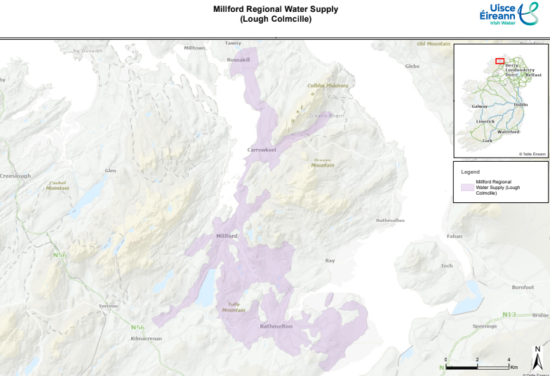 The water levels at Lough Colmcille (which supplies water to the Milford area) are lower than previously recorded at this time of year and it is expected, based on the typical trend for this time of year, that water levels will now start to decrease for the summer period. It is considered that significant levels of rainfall over a prolonged period of time are required for this source to recover.