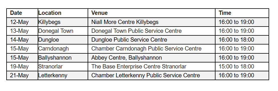 Events take place in Killybegs on Monday May 12th, Donegal Town on Tuesday May 13th, Dungloe on Wednesday May 14th, Carndonagh and Ballyshannon on Thursday May 15th, Stranorlar on Monday May 19th and Letterkenny on Wednesday May 21st.