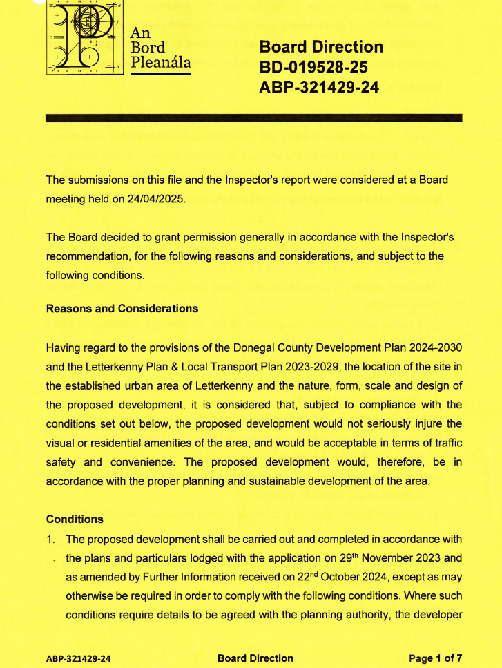 Donegal County Council had granted permission for the development at Lisnennan in November, and it was subsequently appealed to the planning authority.
