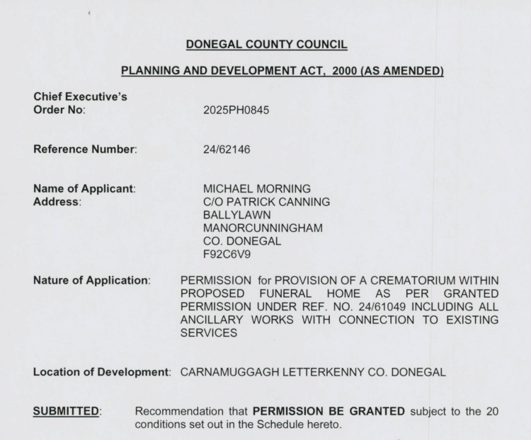 Full planning permission has been granted for the development of a crematorium in Letterkenny.
