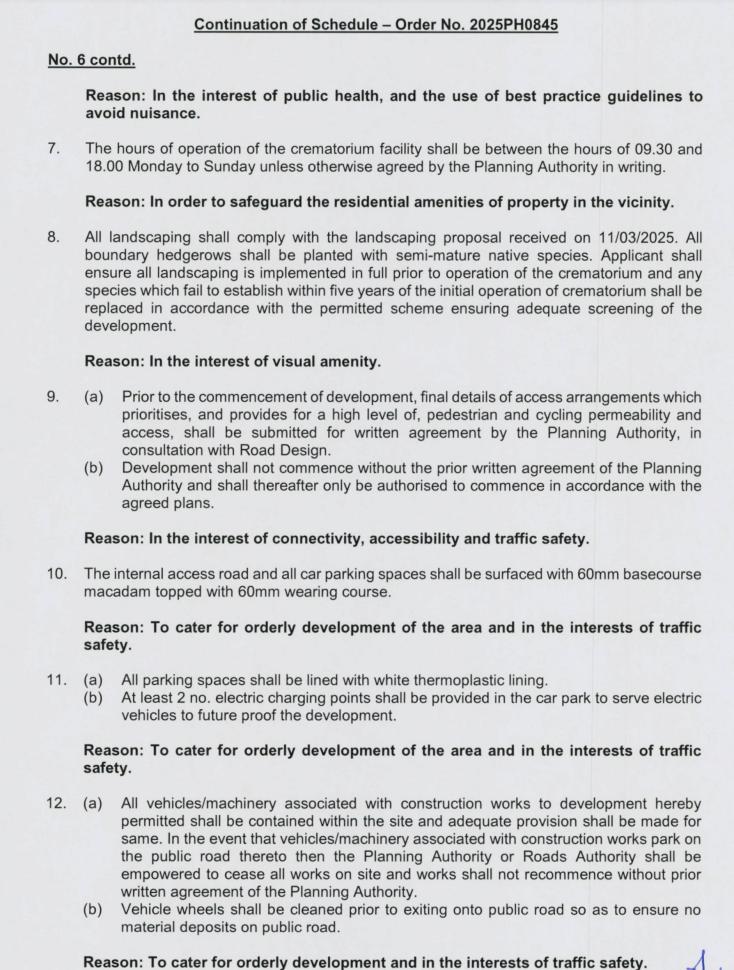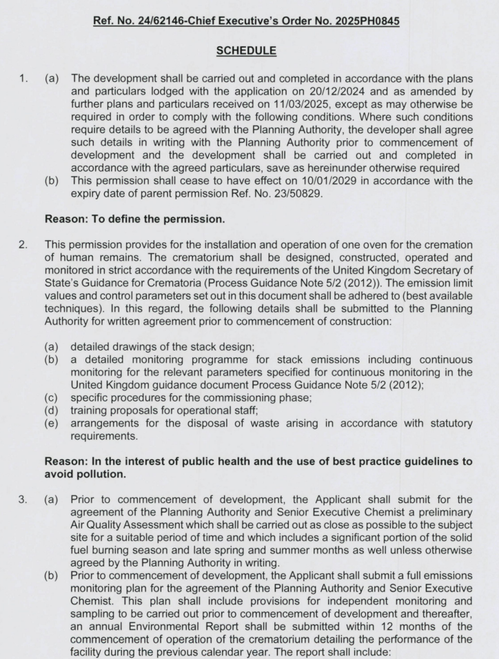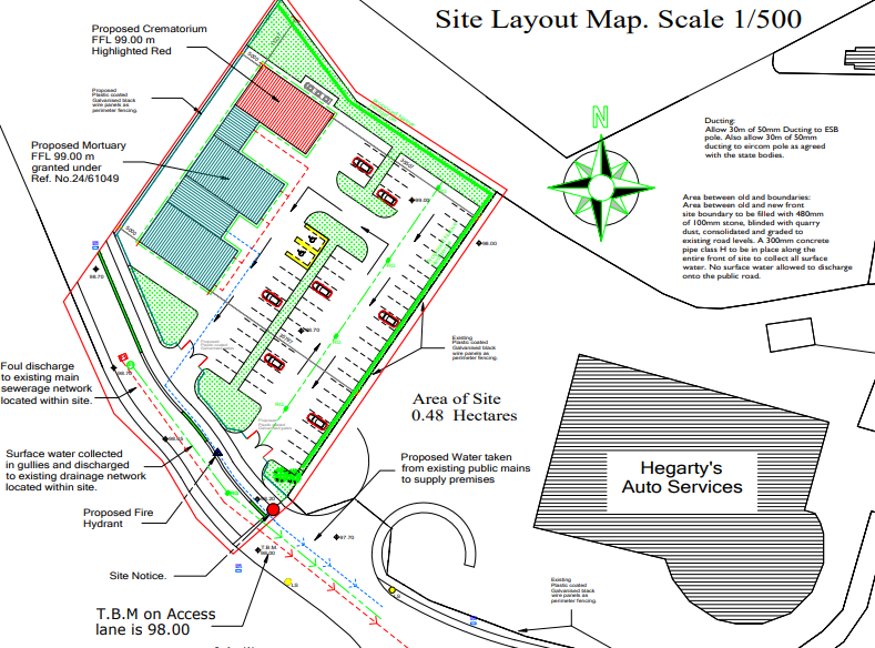 The facility will be developed within a new funeral home in the Carmamuggagh area, subject to twenty conditions.