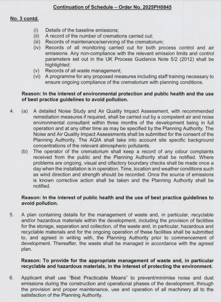 They include the submission of a comprehensive waste management plan before the facility begins operating, and the carrying out of a detailed noise study and Air Quality Impact Assessment within three months of the beginning of operations.