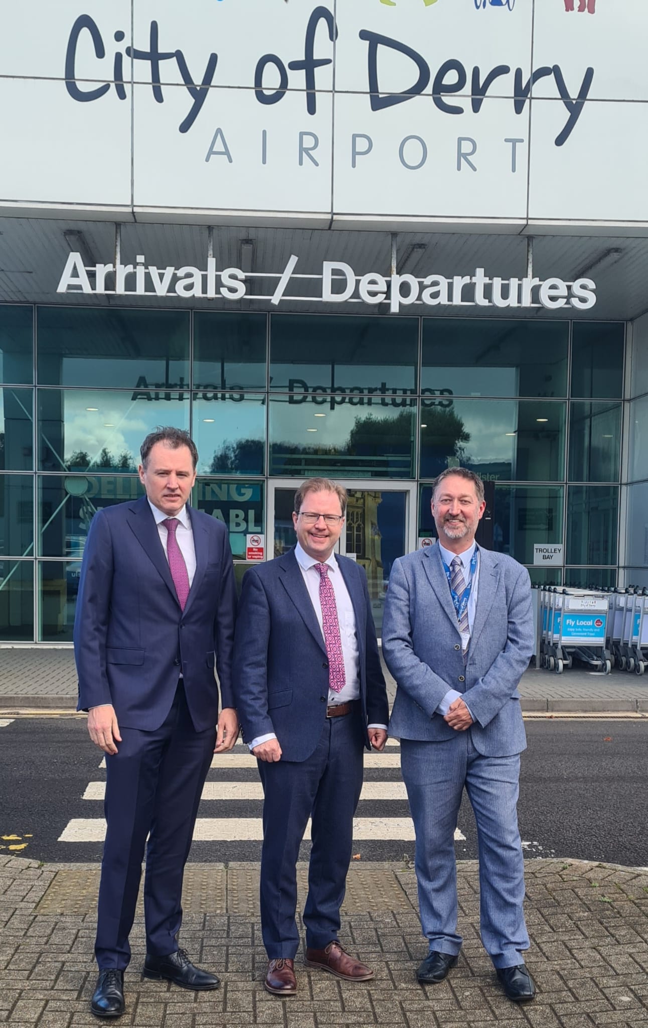 Minister Charlie McConalogue, pictured with Minister James Lawless and City of Derry Airport Managing Director, Steve Frazer, during a visit to the airport in September 2024.