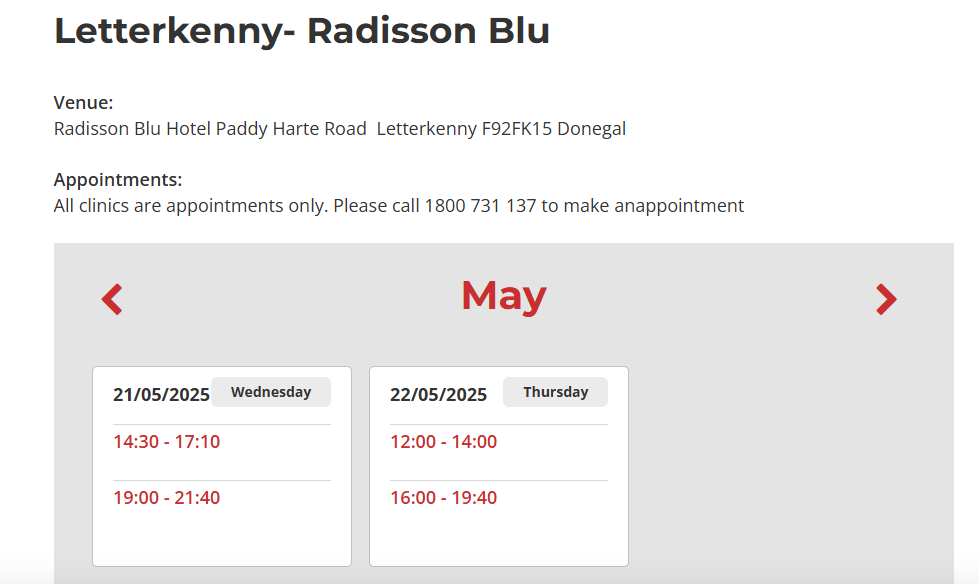 There are clinics today and tomorrow at the Radisson Blu Hotel in Letterkenny.