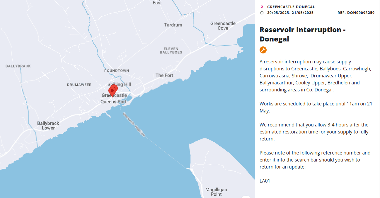 Uisce Eireann says the affected areas include Greencastle, Ballyboes, Carrowhugh, Carrowtrasna, Shrove, Drumawear Upper, Ballymacarthur, Cooley Upper, and Bredhelen.