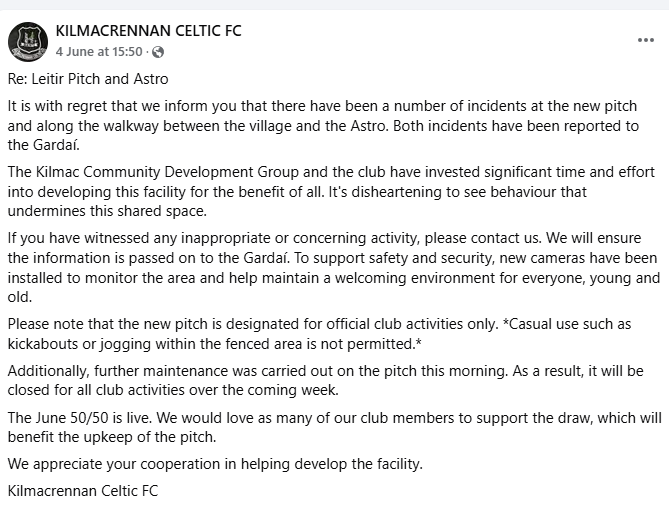 The latest incident follows the recent allocation of €75,000 for gym equipment after a previous €125,000 grant towards the development of the pitch.