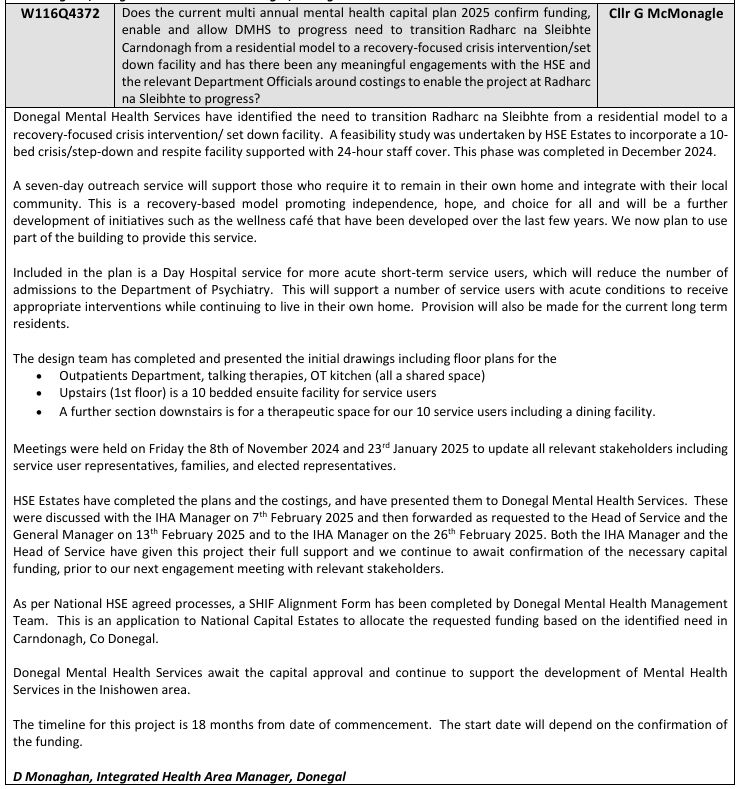 An Inishowen Councillor is urging the government to swiftly provide the funding necessary to transition Radharc na Sleibhte in Carndonagh from a residential model to a recovery focussed crisis intervention and set down facility.