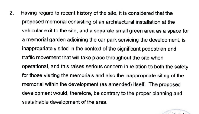 Having regard to recent history of the site, the commission said the proposed memorial and memorial garden adjoining the car park are inappropriately sited in the context of the significant pedestrian and traffic movement that would take place throughout the site.