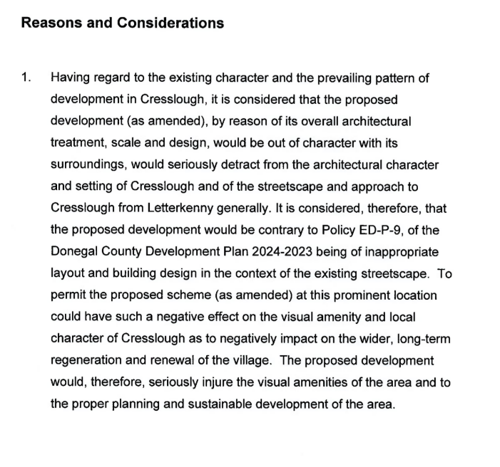 The planning appeals board says it was refusing the development because it would be out of character with its surroundings, and seriously detract from the architectural character and setting of Creeslough.