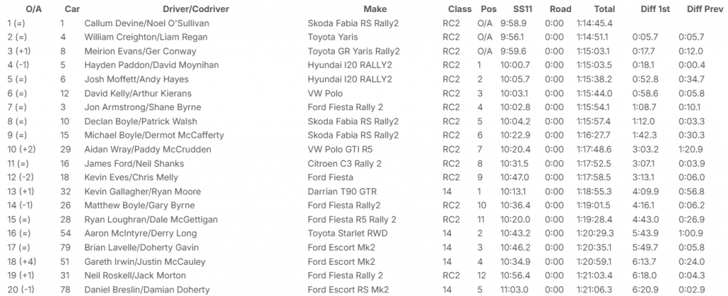 Callum Devine and Noel O’Sullivan still lead the Donegal International Rally but William Creighton and Liam Regan are closing the gap slowly but surely after Stage 11 at the infamous Knockalla.