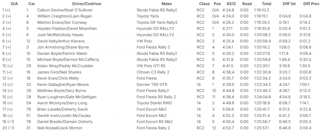 As a hectic Rally Saturday heads for the final two stages at Knockalla and Garrygort, Callum Devine and Noel O’Sullivan are still the men to catch in their Skoda Fabia RS Rally 2.